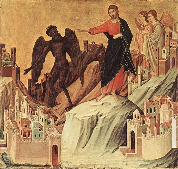 For the second test (Satan) led Him up and spread out all the kingdoms of the earth on display at once. Then the Devil said, “They’re Yours in all their splendor to serve Your pleasure. I’m in charge of them all and can turn them over to whomever I wish. Worship me and they’re Yours, the whole works.”Jesus refused, again backing His refusal with Deuteronomy: “Worship the Lord your God and only the Lord your God. Serve Him with absolute single-heartedness.”For the third test the Devil took Him to Jerusalem and put Him on top of the Temple. He said, “If you are God’s Son, jump. It’s written, isn’t it, that ‘He has placed you in the care of angels to protect you; they will catch you; you won’t so much as stub your toe on a stone’?”“Yes,” said Jesus, “and it’s also written, ‘Don’t you dare tempt the Lord your God.’” ~ Luke 4: 5-12 (TM)
