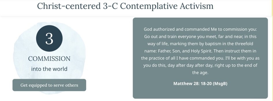 As we see it, every follower of Jesus of Nazareth is called by the Master to go, in His Name, to bless those around us, giving away all the goodness and blessings the Triune God has bestowed upon us. Now that you’ve been practicing the presence of Christ in your own life (Communion with God), and you’ve been experiencing the joys of deeper relationship with others (Community with Others), might we suggest you respond to Jesus’ Commission into Our World …